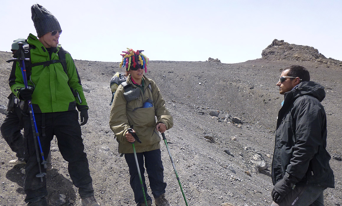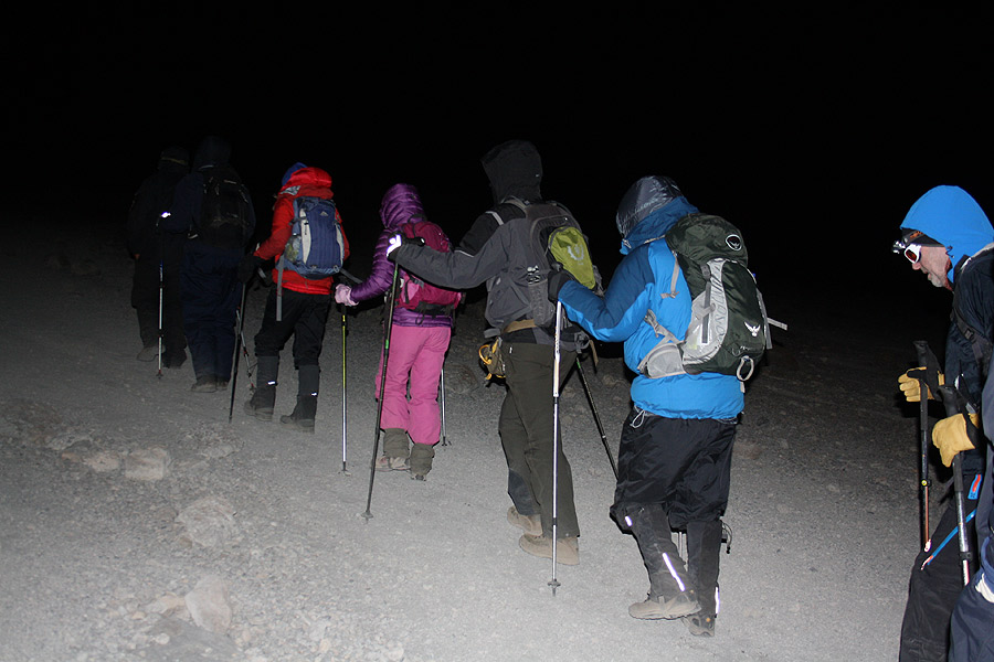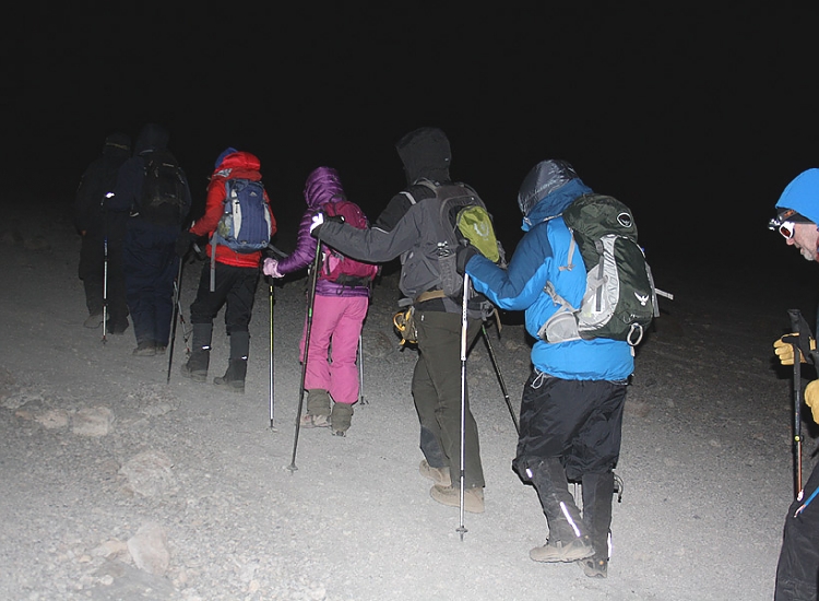 Today we climb gradually, then cross the lunar desert of the “Saddle” between Mawenzi and Kibo to reach our campsite which sits at the bottom of the Kibo crater wall. Once at camp we rest, enjoy dinner and prepare for the next day.
