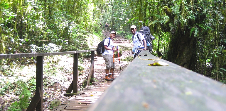 After breakfast we head to the National Park gate for the necessary formalities before beginning our trek. The trail climbs through a tropical rain forest, near the upper edge of the forest line (keep an eye out for blue monkeys). The trail then widens to expose beautiful hillsides until we reach Mandara Hut.
